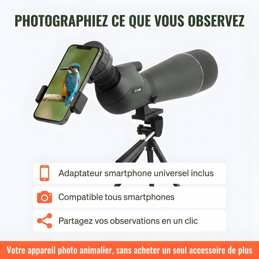 Kit inclus Longue vue · Trépied 360° · Adaptateur smartphone · Housse · Bouchons · Chiffon