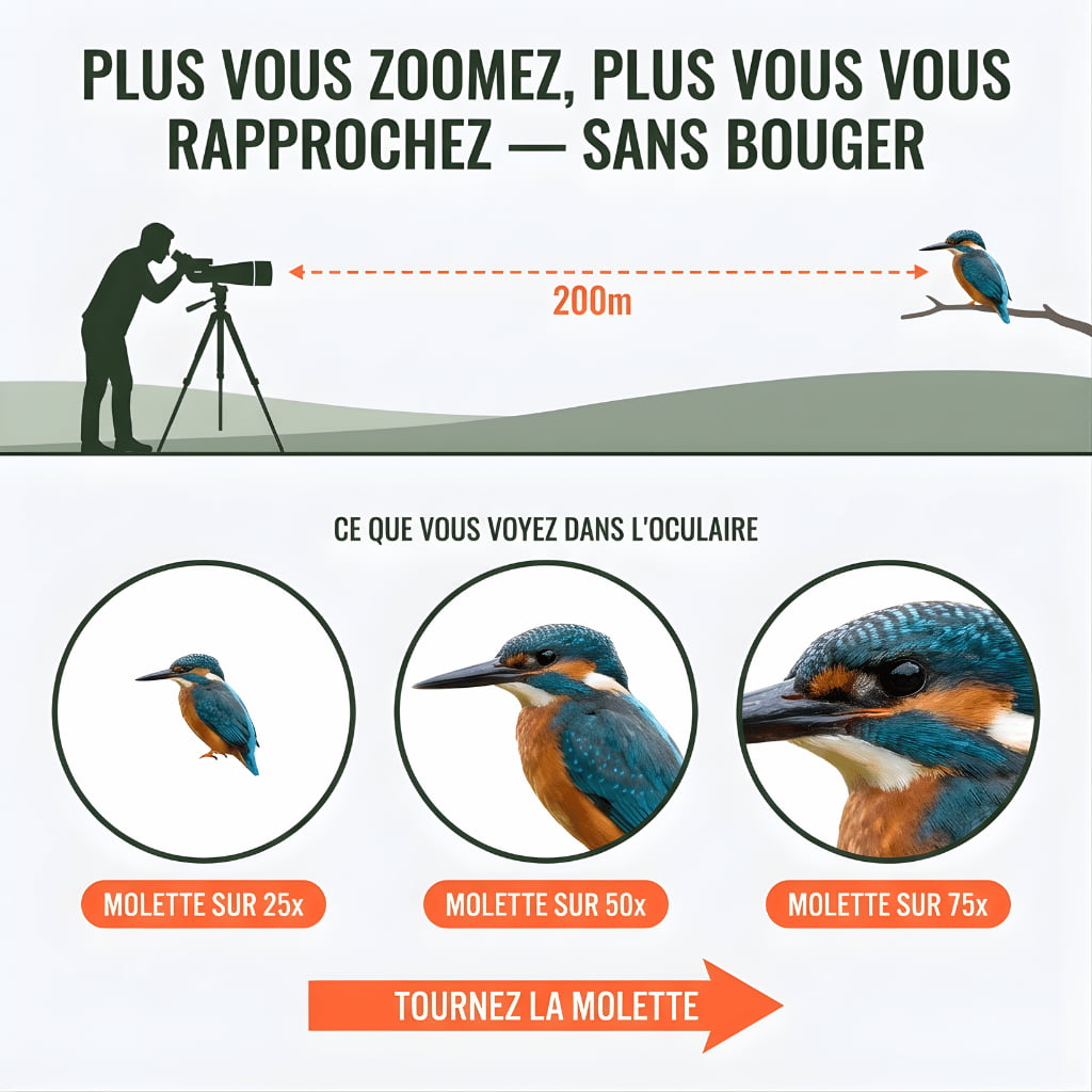 Tournez la molette, passez de la vue d'ensemble au détail de plumage en 1 seconde.